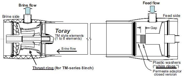 確認(rèn)已經(jīng)安裝了用于吸收 TM-系列 8 寸膜元件軸向推力的止推環(huán)(這是壓力容器的一個配件),它會傳遞來自于濃水側(cè)膜元件的軸向推力(這是安裝的首支膜元件)。
