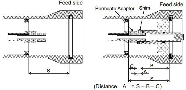 k 當(dāng)所有的膜元件裝填完畢后,計算“A”值。如果“A”值比壓力容器廠家提供的墊片厚度大,使用墊片填充過大的間隙。剩余的間隙應(yīng)小于墊片厚度。如果產(chǎn)水管連接在壓力容器的進水側(cè),那么產(chǎn)水適配器的機械分離風(fēng)險會非常高。