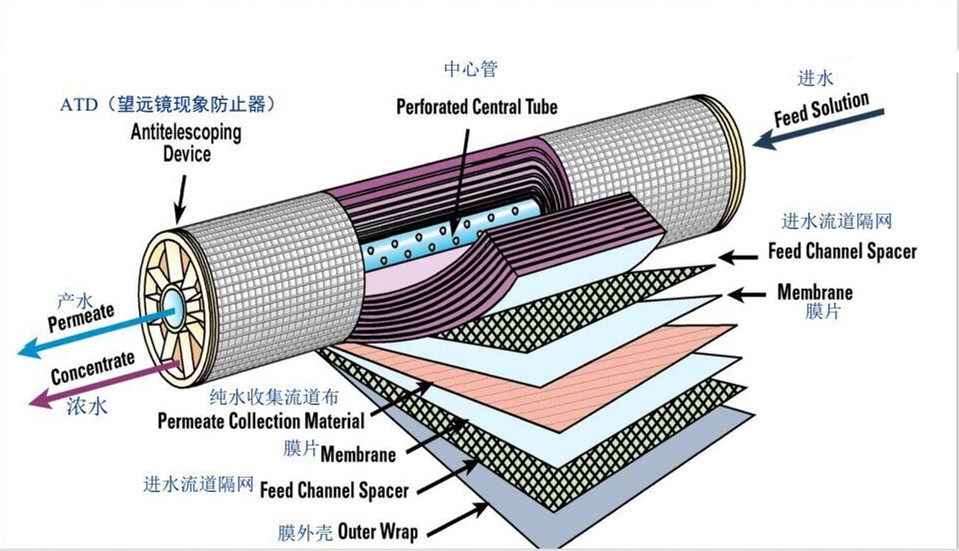 卷式RO膜元件結(jié)構(gòu)示意圖