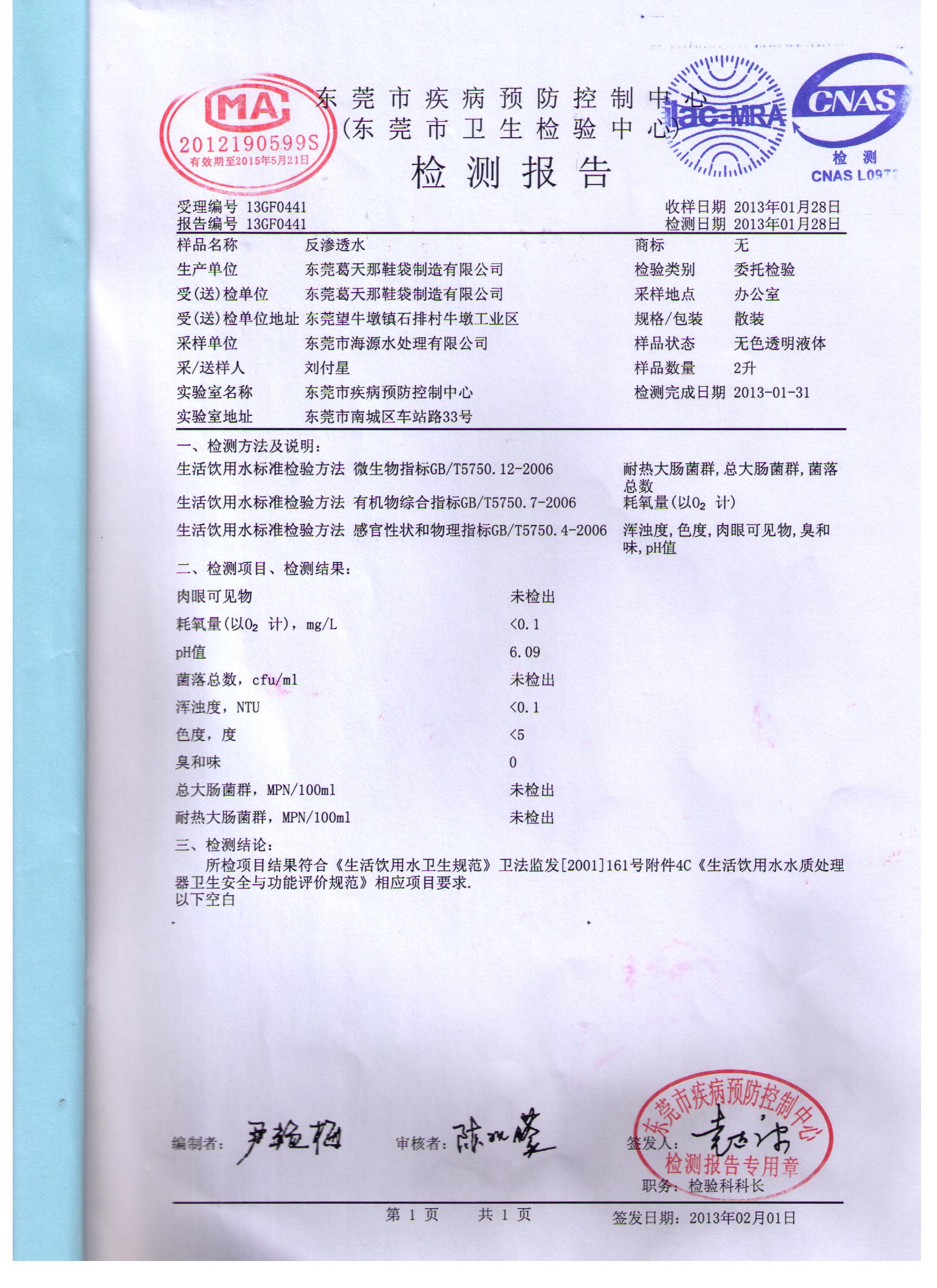 第一級(jí)采用石英]]>Sat, 16 Mar 2013 00:00:00 GMT<![CDATA[東莞葛天那鞋袋制造有限公司RO直飲水水質(zhì)檢測(cè)報(bào)告]]>祝賀我司為東莞葛天那鞋袋制造有限公司提供RO直飲水機(jī),現(xiàn)已安裝完畢,水質(zhì)均符合直飲水檢測(cè)標(biāo)準(zhǔn)。
